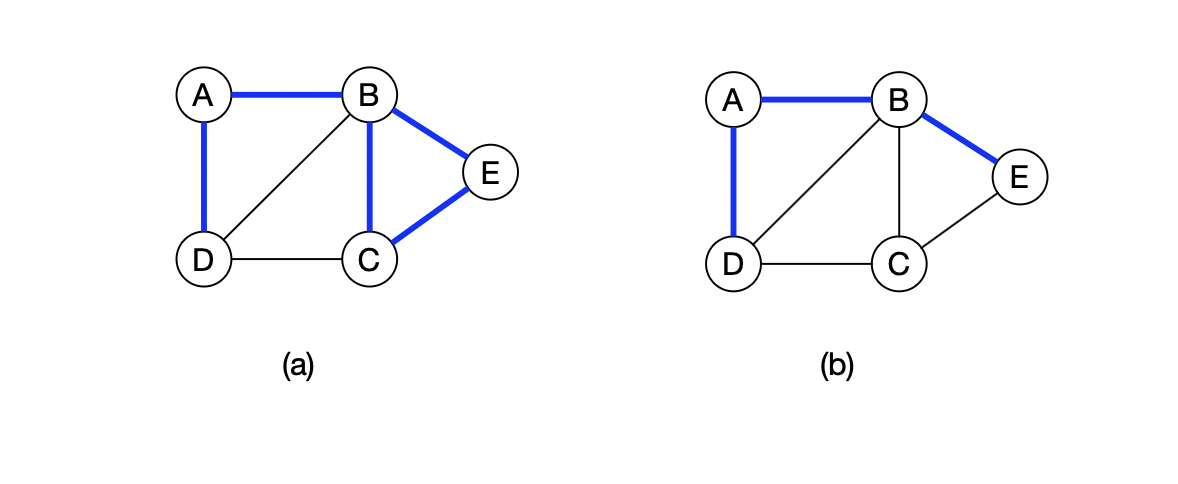 Eksempel: Figur \((a)\) viser vandringen \(B\), \(C\), \(E\), \(B\), \(A\), \(D\). Figur \((b)\) viser stien \(D\), \(A\), \(B\), \(E\).