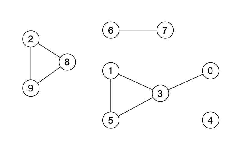 Vi kan også bruge BFS til at finde alle sammenhængskomponenterne i en graf. I det følgende vil vi gerne lave en komponentliste for grafen. I komponentlisten skal der stå samme tal ud for \(2\) knuder hvis de er i samme sammenhængskomponent.
